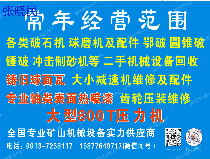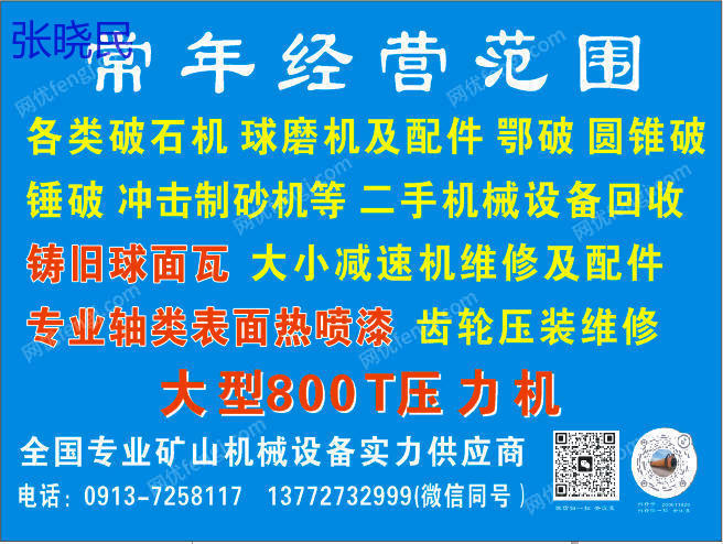 【800T大型压力机供应】 29年矿山机械专业实力,重诚信、懂共赢、知人善任! 长年经营全系列矿山设备及服务: ??破碎设备:鄂破、锤破、圆锥破、冲击制砂机 ??磨矿设备:各类球磨机及配件 ??辅助设备:洗沙一体回收机 ??维修服务:铸旧球面瓦、大小减速机维修及配件、专业轴类表面热喷涂、各类齿轮压装及维修 如需采购或技术支持,欢迎随时联系,期待与您共赢合作!
