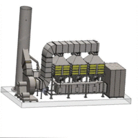含尘气体由进气口进入灰斗,粉尘与导流板发生碰撞,较粗颗粒的粉尘在撞击下受惯性力和重力的作用落入灰斗,较细的粉尘以均匀的速度进入箱体,经滤袋过滤后,粉尘被挡在滤袋的外面,气体通过滤袋成为干净的气体,经净化后的气体沿滤袋内部进入净气室,通过风机排除
